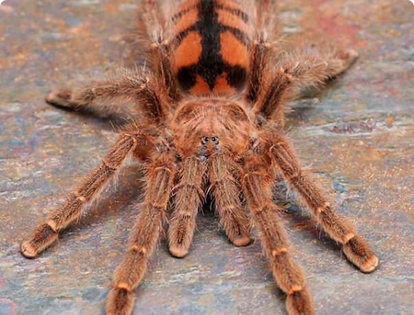 По размеру этот птицеед небольшой, длина тела всего 4-5 сантиметров, а в размахе лап вырастает около 12 сантиметров.