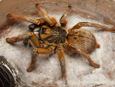 Кормление этого паука птицееда ни чем принципиально не отличается от кормления других пауков птицеедов. Разве что следует учитывать, что паук очень быстрый и агрессивный, и внимательней подходить к процедуре открывания террариума, и закидывания туда корма. В остальном все также, кормить насекомыми, подходящими по размеру (примерно с тело паука), взрослой особи можно давать мелких позвоночных: ящериц, новорожденных крысят, но это не рекомендуется. Кормить взрослого птицееда надо 1-2 раза в неделю.