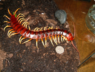 Свой статус «гигантской», сколопендра получила за то, что может достигать в длину 26 см. Но встречаются и более крупные экземпляры. Гигантская сколопендра покрыта жестким панцирем красно-коричневого цвета на каждом сегменте, всего их может насчитываться 21-23. Соответственно у каждой такой многоножки 21 пара ножек ярко желтого цвета. Первая пара этих ножек превратилась в ногочелюсти с коготками, при помощи которых она вгрызается в жертву и впрыскивает яд.