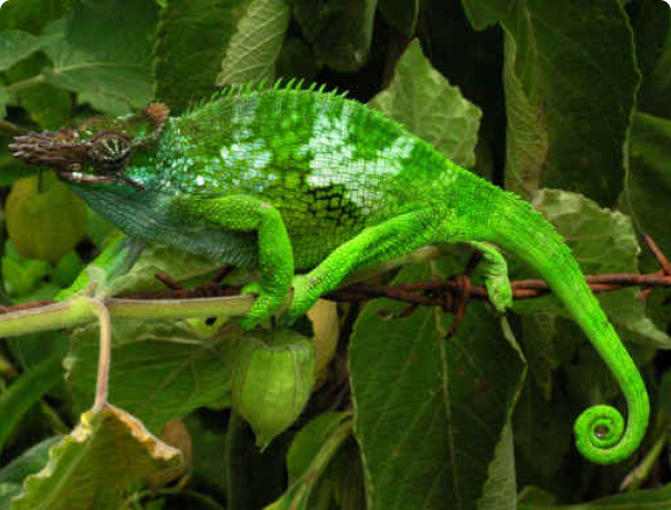 Хамелеон является одним из самых метких стрелков в животном мире. Его длинный язык с воронкой-углублением на конце присасывается к насекомым, стреляет хамелеон на расстоянии 20-30 см и редко промахивается. При этом он может выгнуть язык так, что кончиком языка, не задевая лист, достанет насекомое, притаившееся за ним.