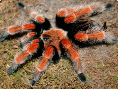 Брюшко, первые и последние сегменты ног - черные, а вся остальная часть тела очень яркого, огненно-красного цвета. Размер тела взрослых пауков - 7-8 см, а размах лап примерно до 18 см.
