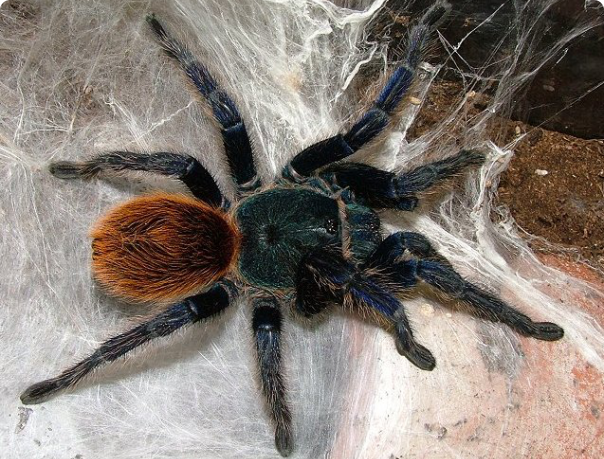 Один из самых ярких и красивых пауков-птицеедов. Его окраска имеет сочетание цветов: красно-оранжевое брюшко, ярко-синие конечности, зеленый карапас.
