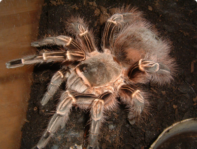 В длину может вырастать до 12,5-15 см. Общая окраска черновато-коричневая, на лапах имеются рыжеватые симметричные полосы. Темпы роста этого паука медленные.