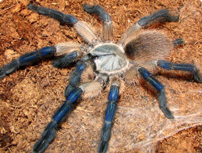 Размеры взрослых пауков не очень большие: самки вырастают до 6-7 см, самцы – до 5-6 см. Особенностью внешнего вида являются ярко-синие лапы с желтоватыми подпалинами.