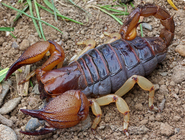 Размеры тела взрослых особей от 9 до 11,5 см. Основная окраска от темно-коричневого до ржаво-коричневого, а ноги и клешни окрашены в более светлый отттенок. Клешни и педипальпы очень широкие и массивные, хвост узкий.