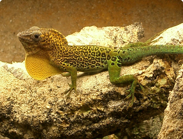 Anolis marmoratus speciosus: Спина и живот ярко-зеленые, окраска переходит в голубовато-зеленый хвост, область вокруг глаз и шея голубого оттенка. Горловой мешок - желтый с зеленым оттенком.