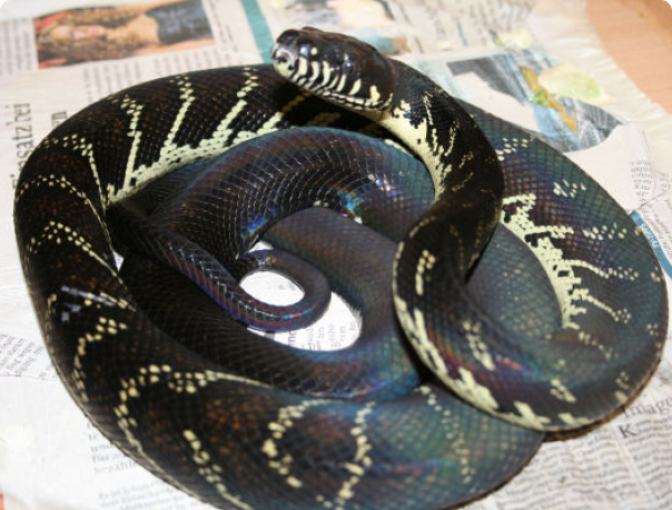 Питоны Белена - большие, толстые, гладкие змеи с поразительным цветным рисунком из белых или желтых линии, идущих вертикально по спине, на черном фоне, имеющим пурпурно-синий переливающийся блеск. У питонов большие глаза с вертикальными зрачками. Достигают в среднем 1.8-2.4 м в длину.