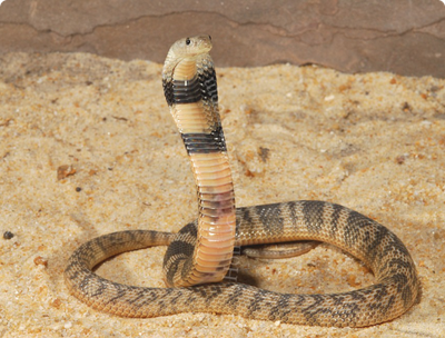 Потревоженная кобра поднимает вверх переднюю часть тела до 1/3 его длины, расширяя шею и примыкающую часть туловища.