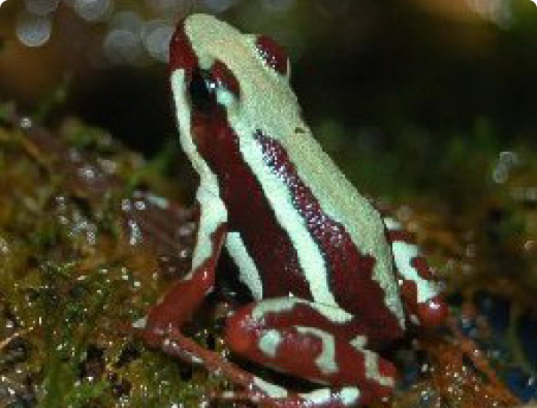 Мелкий древолаз, самки достигают в длину 22-26 мм, самцы мельче – 21-23 мм. Заметны существенные различия в окраске между дикими особями и разведенными в неволе. Дикари характеризуются интенсивной ярко-красной окраской. По хребту от кончика морды до крестца проходит широкая желтоватая полоса. На боках тела продольные ряды вытянутых белых пятен, сливающихся в полосы. Конечности также пятнистые. Разводные особи не такие нарядные, более темные, часто коричневые с более узкими полосами кремового оттенка.